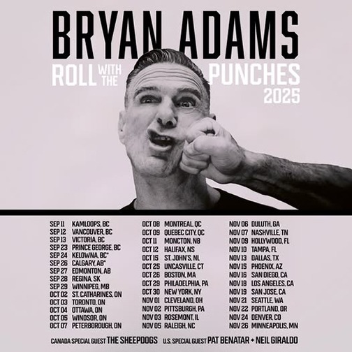 C’est parti pour la nouvelle tournée de Bryan Adams, il parcourt le pays de la Colombie-Britannique jusqu’à Terre-Neuve pour faire la promotion de son dernier album Roll with the punches qui est sorti plus tôt cette année. La première avait lieu à Kamloops dans l’Okanagan la veille du spectacle que je suis allé voir à Vancouver au Rogers arena. La tournée se poursuivra ensuite à travers les États-Unis avec Pat Benetar en première partie. Ici au Canada, il y une alternance entre The Sheepdogs et Amanda Marshall. Il se rendra ensuite en Grande-Bretagne. Quelques mois avant cette tournée, il avait fait quelques spectacles au Wynn à Las Vegas, toujours pour la promotion de ce même album.