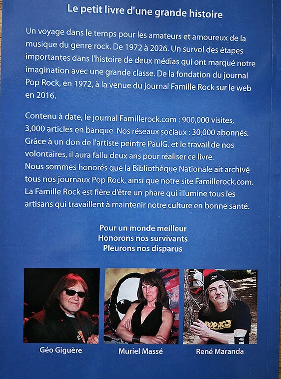 Un voyage dans le temps pour les amateurs et amoureux de la musique du genre rock. De 1972 à 2026. Un survol des étapes importantes dans l’histoire de deux médias qui ont marqué notre imagination avec grande classe. De la fondation du journal Pop Rock, en 1972, à la venue du journal Famille Rock sur le web en 2016. Contenu à date FRCO : 777 000 visites, 2900 articles en banque. Chiffres FPR 22 000 abonnés, etc. Grâce à un don de 4 000$ de l’artiste peintre Paul Gauthier et le travail de volontaires, des auteurs Muriel Massé, René Maranda et Géo Giguère, qui ont mis 2 ans à le réaliser. La Famille Rock est honorée d’être un phare qui illumine tous les artisans qui travaillent à maintenir notre culture en bonne santé.