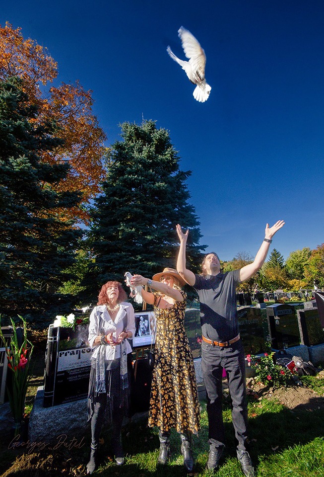 Madame Colombe arrive avec trois belles colombes qu’on prévoit lancer pour qu’elles s’envolent. (Et bien, surprise! Celle aux mains de Claudine