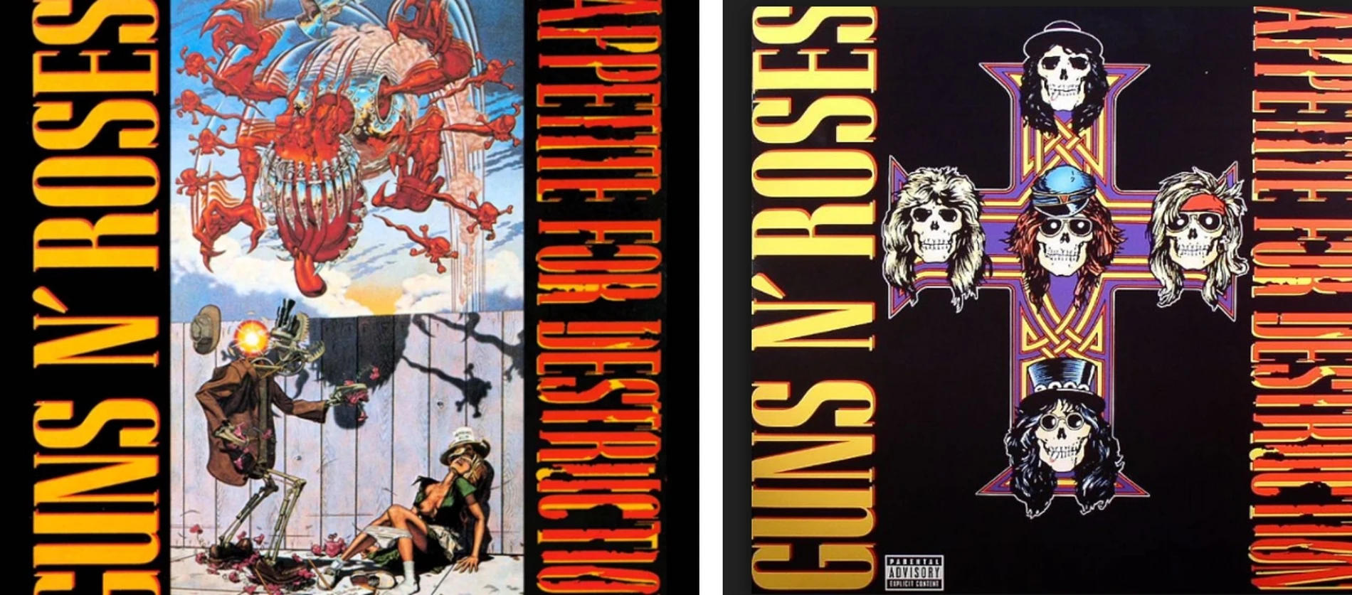 La pochette originale d’Appetite for Destruction est une œuvre de Robert Williams peinte en 1977 représentant un monstre de métal en train de s’abattre sur un robot ayant violé une jeune femme allongée sur le trottoir. Axl Rose était allé voir en personne Robert Williams pour lui demander la permission d’utiliser la toile. Ce dernier accepta, mais les avertit qu’ils auraient des ennuis en faisant ce choix.