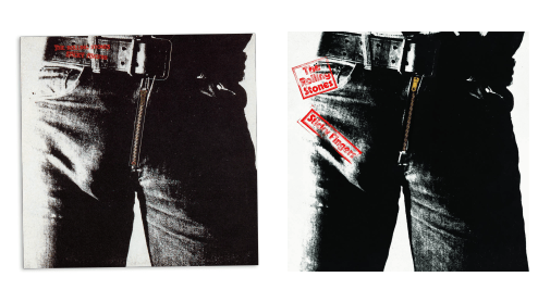 La pochette de l’album Sticky Fingers dispose d’une fermeture éclair qui s’ouvre pour révéler un homme en sous-vêtements de coton. Elle a été imaginée par l’artiste pop art américain Andy Warhol, photographiée par Billy Name et effectivement conçue par Billy Name. La photographie représente un entrejambe masculin serré dans des jeans étroits. Contrairement à une idée répandue parmi les fans du groupe, il ne s’agit pas de celui de Mick Jagger.